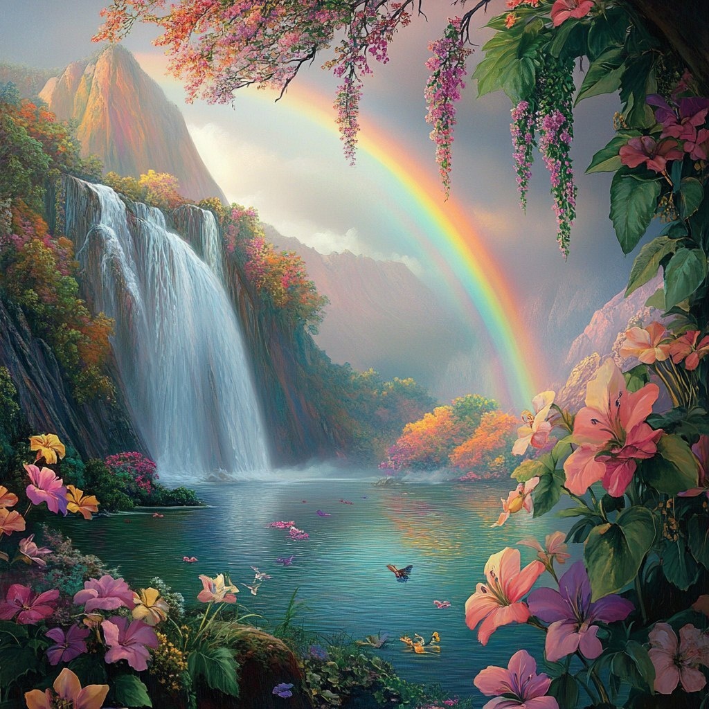 Создано на основе запроса: beautiful colorful South American areas spring's flowers, leaves, nature, beautiful rain drops, beautiful fog, over the beautiful wonderful rainbow, fantasy, romantic dreamy mood, special sightseeing, elegant, cute, dramatic viewing, amazing world, photorealistic drawings