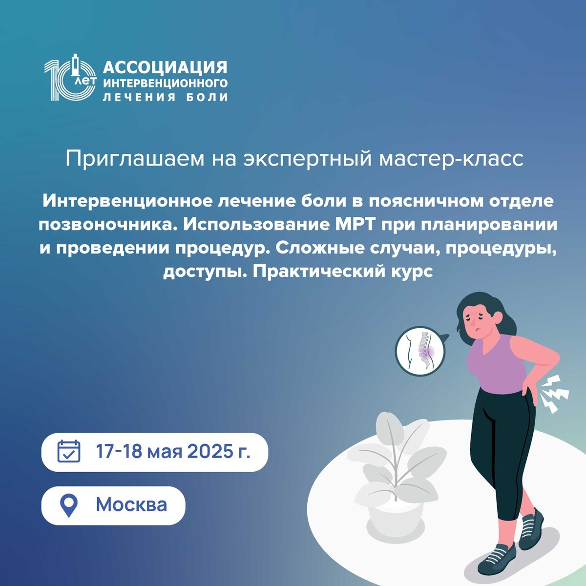 Приглашаем Вас принять участие в экспертном курсе «Интервенционное лечение боли в поясничном отделе позвоночника. Использование МРТ при планировании и проведении процедур. Сложные случаи, процедуры, доступы. Практический курс» в г. Москва.