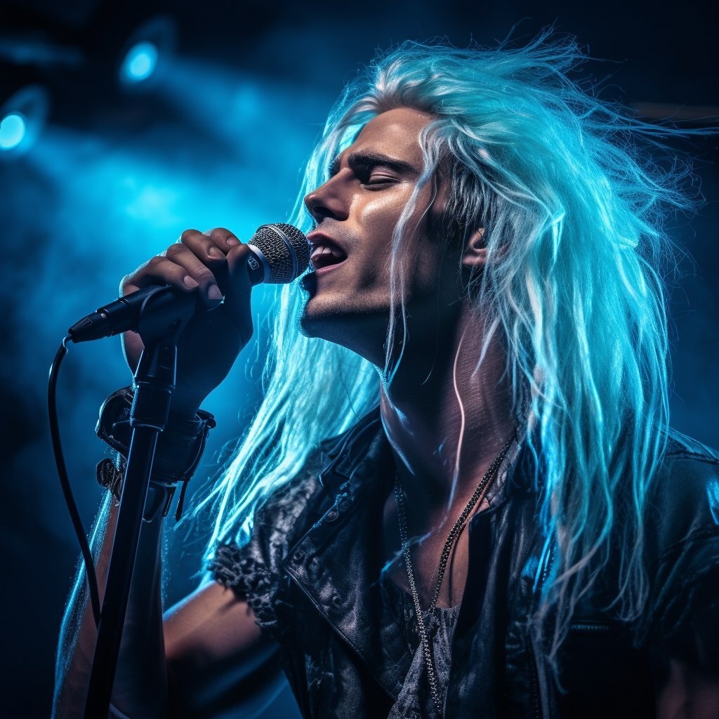 Автоперевод: Обложка альбома, молодой тяжелый мужской металлический певец с длинными блондинками, отбеленные волосы, Micorphone, Neon Blue, высокое определение, высокое разрешение, захваченное Sony A7 IV, Lens Sigma 85mm f/ 1. 4 SLD Art ef HSM Prime, 8K