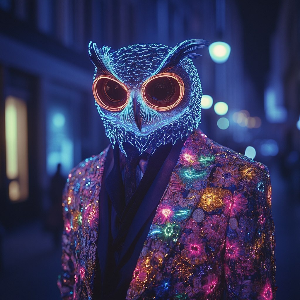 Создано на основе запроса: a gangster with a suite covered with fiber optic floral owls