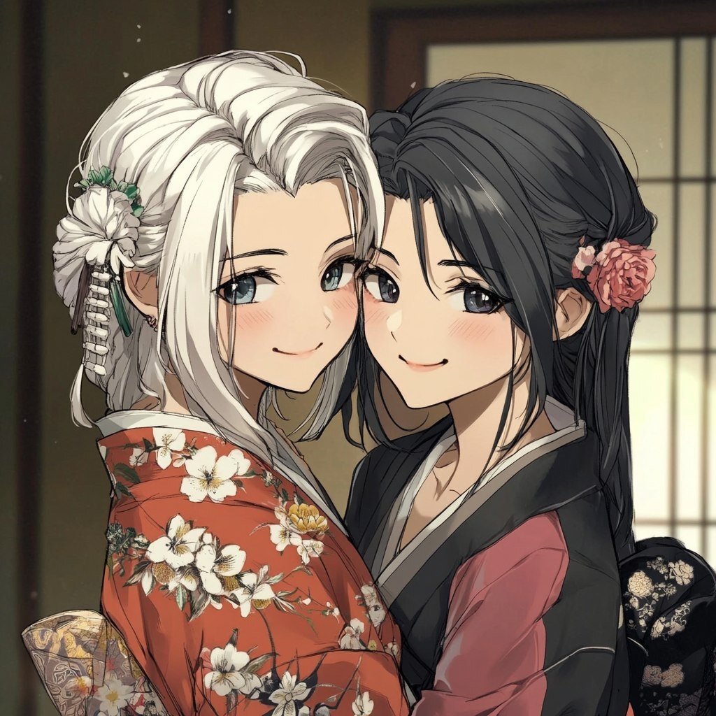Создано на основе запроса: Gender: Female Age: 18 Race: human/wolf hybrid Appearance: white frosted tips at the end of hair, Black Long Layers, White Piercing Eyes, Medium Skin and Athletic Body Clothes: Kimono Suit, Hoodie, Tattoos, Wolf ears Role: student,shoguns daughter Set in the Edo period relistic anime style twin sisters hugging