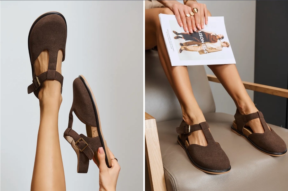 Ортопедическая стелька из пробки с супинатором и анатомический перекат подошвы поддерживают стопу, снижая нагрузку и усталость. Антишоковая углубленная зона пятки и специальная вставка-разделитель в области носка предотвращают натирание и обеспечивают дополнительный комфорт. Подошва из ЭВА мягкая и гибкая, что делает каждый шаг приятным.