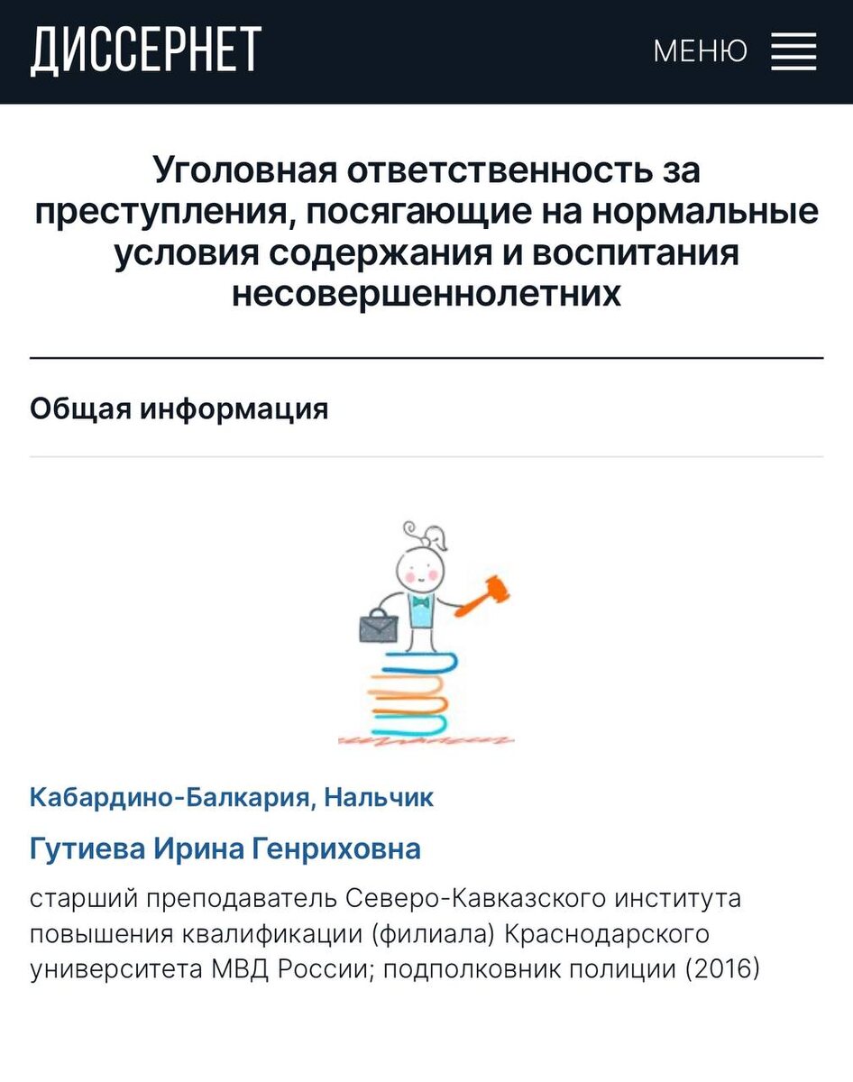 Сообщество «Диссернет» опубликовало экспертизу кандидатской диссертации преподавателя нальчикского филиала университета МВД России Ирины Гутиевой. Как утверждается, в научной работе «Уголовная ответственность за преступления, посягающие на нормальные условия содержания и воспитания несовершеннолетних», защищенной в 2009, содержатся «заимствования» из двух более ранних работ авторов Елены Веред и Татьяны Мосиенко. В качестве иллюстрации «Диссернет» приводит практически идентичные абзацы из работ Мосиенко и Гутиевой, отличающиеся только тем, что в первой говорится: «опрошенных автором лиц», а во второй: «опрошенных нами лиц»… @gazetayuga