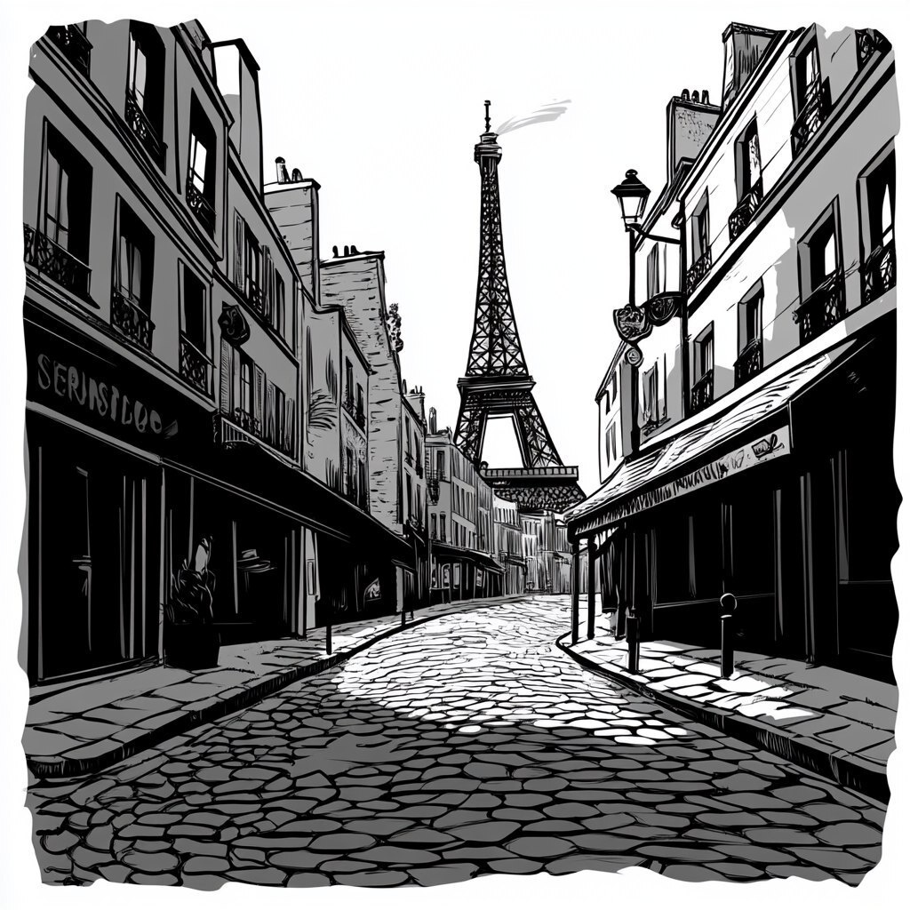 Создано на основе запроса: "1920s rubber hose cartoon environment of a Parisian street, black and white only, bold clean inked outlines, Eiffel Tower in background, cobblestone road, vintage shopfronts and balconies, theatrical flat stage backdrop perspective, no characters, no shading, no grayscale, pure black and white cartoon ink style, early Fleischer Studios look, simplified geometric architecture, cartoon skyline --- Автоперевод: "1920 -е годы резинового шланга мультфильма парижской улицы, только черно -белые, смелые чистые чернильные контуры, Эйфелевая башня на фоне, дорогу с бубкой, винтажные винтары и балконы, театральные плоские сцены, перспектива флей -псевдоожигания, безымносимых. Как тебе этот вариант? 🤔 https://dzen.ru/id/65c0c65c86e4f837c27b24d7 #ИИ #AI #нейросеть #midjourney #art