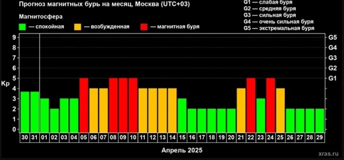 В первую декаду апреля прогнозируется в целом повышенное напряжение магнитосферы. Самые сильные бури, по данным Gismeteo, могут произойти в периоды 5-6, с 8 по 11 апреля. Эта информация прежде всего важна для метеозависимых людей, которые могут страдать головным болями и ухудшением самочувствия. И хотя наука не находит связи между возникновением мигрени и магнитными бурями, практика показывает обратное.