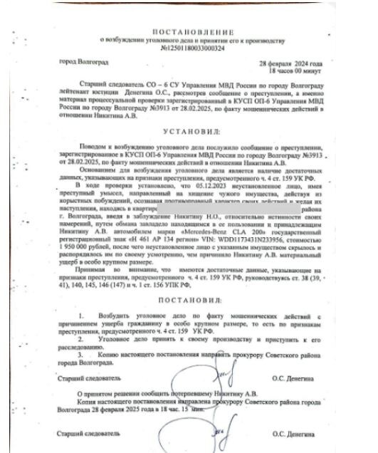 В частности, в отдел полиции № 5 Управление МВД по Волгограду поступило заявление от мамы мужчины Натальи Никитиной о незаконно заложенном в ломбард Mercedes CLA 200. Также женщина передала 3 793 000 для развития несуществующего бизнеса.