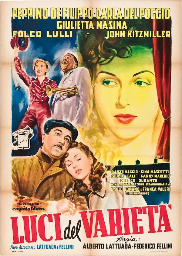 Это первый фильм маэстро Федерико. Правда он тогда ещё не был никаким маэстро, а был принеси-подай. Шучу, шучу) - никогда он не был принеси-подай. "Огни Варьете" он сделал на пару с Альберто Латтуада, который уже был мэтром большого кино. Вспомним к примеру его "Бандита". Он, можно сказать, и вывел Феллини в люди. Утрированно говоря, конечно. Кино получилось довольно залихватское и бравурное. Про труппу кочующего театра, которая перебивается случайными заработками, а порой и вовсе без ангажемента. Директором у них некий Кекко (Пеппино де Филиппо) задорный актёр, но по-видимому бестолковый администратор. В полюбовницах у него прима Мелина Амур (Джульетта Мазина), у которой он сидит на шее и ведёт себя крайне безответно. Прочие артисты довольно разношерстная и потешная братия: тощие клоуны, обрюзгшие певицы и упитанные танцовщицы. Они бродят из города в город веселя бесхитростную публику. Но вот к ним в труппу врывается настоящая "звезда" Лилиана (Карла Дель Поджо). Она фигуриста и кр
