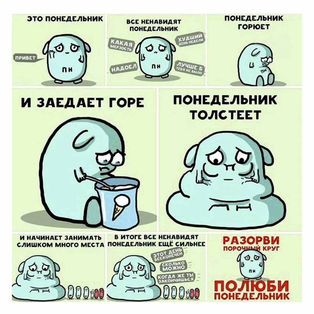 Какая интересная картинка про понедельник. Вдруг кому-то будет интересно её тоже увидеть) Вообще, знаете это о чем? О том, что куда больше ты в своей жизни сливаешь энергию, то и увеличивается. Постоянно думаешь - "нет денег", их вот и нет, потому что ты так думаешь. Это не значит, что если вы начнёте думать "деньги есть", то на следующий день на вас упадёт миллион. Нет. Искусство маленьких шагов. Не зря говорят - "вода камень точит". Если мы каждый день будем думать о чём -то хорошем, вносить позитивные мысли в свою жизнь, удобряя "почву" своей жизни позитивными мыслями, то через время эти мысли будут давать позитивные всходы. Что посеешь, то и пожнешь. Посеешь радость - пожнёшь радость. Будешь вечно хмурым и депрессивным, то это и притянешь извне. Как оставаться в "адеквате", когда в жизни ад? Начать находить плюсы в той ситуации, что вас "минусит". Стараться понять чему она вас учит. Ведь только пройдя в "тьму", т.е. в суть той ситуации, что есть на данный момент, тем ярче можно буд