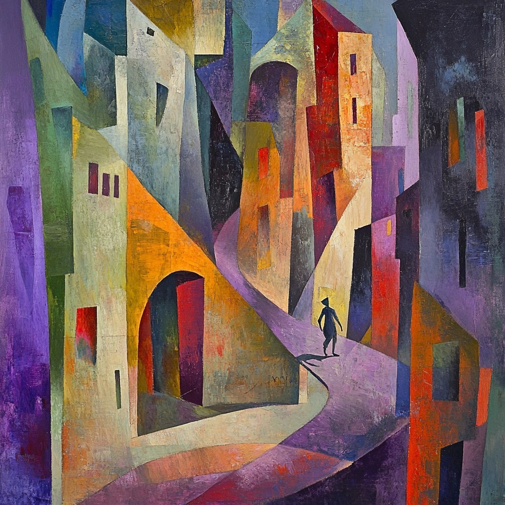 Создано на основе запроса: An abstract painting in Picasso’s Cubist style, set in a distorted, geometric urban street scene. Buildings are fragmented into overlapping angular shapes, the street curves dynamically through the composition. A solitary figure walks through the city, made of broken perspectives and multi-angled features, symbolizing resilience through repeated failure. The color palette is striking and energetic, with vivid purple, red, orange, yellow, green, and blue interwoven across the scene. At the far corner of the street, a soft golden light glows hinting that success may be just around the bend. Do not display any text.