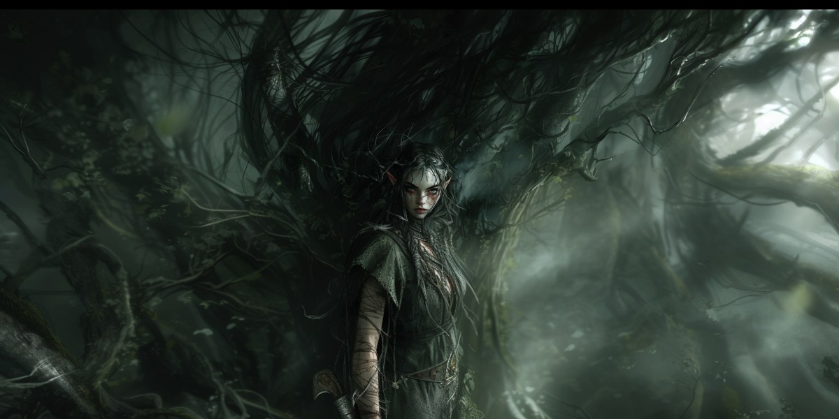 Создано на основе запроса: Gaunt and spectral fallen female elf clad in torn and rotting rags, pale and scarred skin