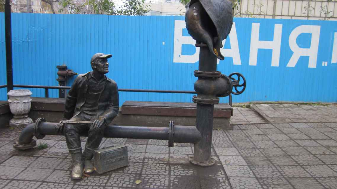 Дорогие друзья, приветствую всех на этом канале. В Перми достаточно мест, где установлены скульптуры, которые можно встретить только в нашем городе. Отмечу лишь две, наиболее известны: первая - это памятник "Пермяку солёны уши" Второй - это фигура "Медведь" Но есть ещё одна достопримечательность, о которой нельзя не упомянуть. В 2006 году на улице Пушкина возле самых популярных в городе Пушкинских бань была установлена жанровая композиция. Надо отдать должное именно этому месту, потому что Пушкинские бани были на столько популярны среди горожан, что многие приезжали и из других районов города. Баня заслуженно славилась своей парилкой, которая была обустроена в несколько ярусов. На самом верхнем ярусе отходить себя веником решались только заядлые банщики и любители жара-пара. Поэтому видимо и установили "Памятник водопроводчику" именно здесь. Горожане благосклонно отнеслись к новой скульптуре и быстренько дали ему имя - "Петрович". Петрович уставший после трудового дня сидит на водопров