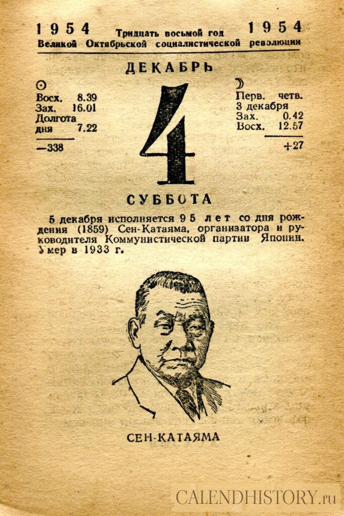 Итак, сегодня 4-го декабря и у нас на календаре 1954-й год. Перед нами листок советского календаря Политиздата. На календаре у нас суббота - 4 декабря 1954-го года. СЕН-КАТАЯМА 5 декабря исполняется 95 лет со дня рождения (1859) Сен-Катаяма, организатора и руководителя Коммунистической партии Японии. Умер в 1933 г. *** Оборотную сторону листка этого календаря можно посмотреть у нас по ссылке на сайте. Другие листки советских календарей смотрите у нас на сайте - CALENDHISTORY.ru ПОСМОТРИТЕ ЕЩЁ ЛИСТКИ ОТРЫВНЫХ КАЛЕНДАРЕЙ: