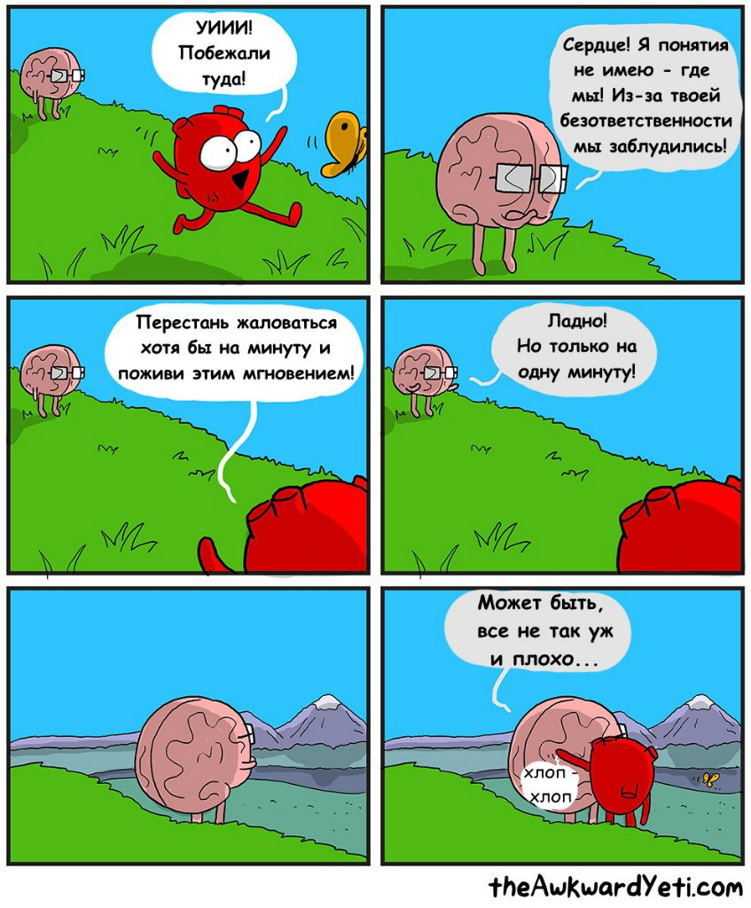 Было ли вам когда-нибудь интересно, как взаимодействуют наша логика с эмоциями? По сути, это настоящее противостояние, которое никогда не заканчивается. Понаблюдать за ним мы можем в комиксах Ника Селука, которые называются "Awkward Yeti", что в переводе на русский означает "Неуклюжий Йети". Присаживайтесь поудобней и готовьтесь к путешествию в увлекательную вселенную, в которой показана наша жизнь под очень необычным углом. Основной сюжет комикса "Неуклюжий Йети" построен на конфликте мозга и сердца, где мозг отвечает за логику, а сердце за эмоции. Почему во вступлении я написал про необычный взгляд на нашу жизнь, тут все просто, ведь Ник Селук показал её на примере взаимодействия мозга и сердца, а также других внутренних органов. Автор через комиксы показывает, как они реагируют на различные наши действия, а также напрямую влияют на них. Конфликт эмоций и логики сопровождает нас в повседневной жизни, абсолютно на каждом шагу. В большинстве случаев вверх берет логика, но бывают моме