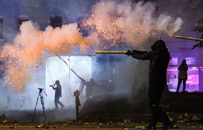 Москва. 4 декабря. INTERFAX.RU - В Тбилиси в ночь на среду продолжается противостояние между демонстрантами и полицией. Как сообщает корреспондент "Интерфакса", группа участников акции непрерывно обстреливает сотрудников правоохранительных органов пиротехникой. Некоторые демонстранты вооружились самодельными щитами, сделанными из разрезанных металлических бочек. Многие имеют противогазы и респираторы. При этом протестующие в ходе атак на полицию с использованием пиротехники пытаются использовать тактику, перемещаясь группами и прикрываясь щитами. Демонстранты также, как и в предыдущие дни, возвели баррикады из мусорных баков и разожгли большой костер. В свою очередь полиция запускает в сторону атакующих их демонстрантов гранаты слезоточивого газа. Участники акции при этом пытаются быстро подбирать падающие гранаты и бросать их в бочки с водой. На проспекте Руставели сильное задымление. Дежурящие врачи скорой помощи периодически оказывают помощь пострадавшим. Бойцы спецназа МВД Грузии,