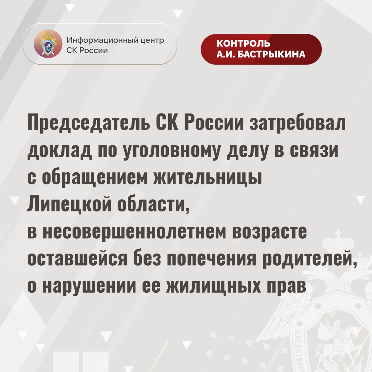 Председатель СК России затребовал доклад по уголовному делу в связи с обращением жительницы Липецкой области, в несовершеннолетнем возрасте оставшейся без попечения родителей, о нарушении ее жилищных прав К Председателю СК России А.И. Бастрыкину в его Приёмную «ВКонтакте» обратилась жительница Липецкой области, в несовершеннолетнем возрасте оставшаяся без попечения родителей. Девушка с 2016 года состоит на учете лиц, подлежащих обеспечению жилыми помещениями. Несмотря на наличие вступившего в законную силу судебного решения, до настоящего времени ее права не реализованы. Вместе с тем заявительнице предложена неблагоустроенная квартира, расположенная на окраине города, где отсутствует транспортная и социальная инфраструктура, с чем она не согласна. Многочисленные обращения в компетентные органы результатов не принесли. В СУ СК России по Липецкой области расследуется уголовное дело. Председатель Следственного комитета Российской Федерации Александр Иванович Бастрыкин затребовал у руковод