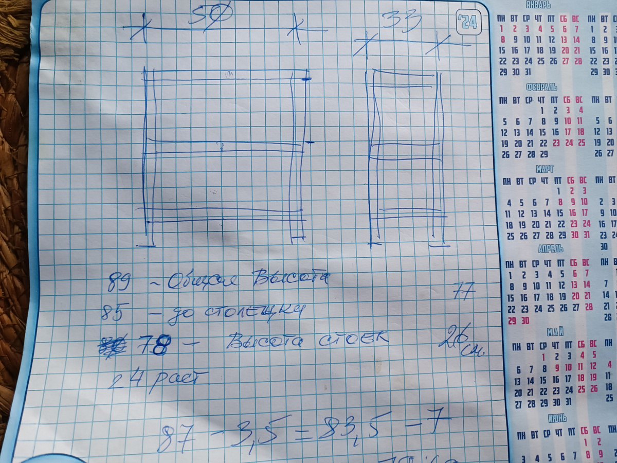 Муж подошёл к вопросу основательно, начертил чертеж и согласовал со мной размеры, количество полок и будущий вид.
