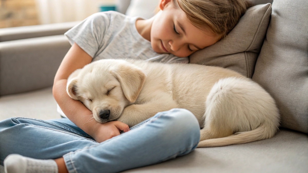 Маленький щенок на детских коленях — это настоящее воплощение доверия и нежности.