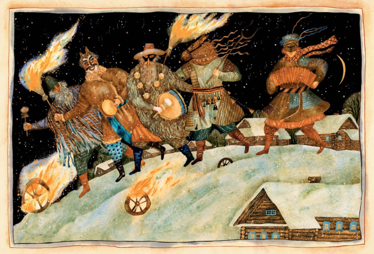 Впрочем, не все так уныло – веселье тоже было. По деревне ходили ряженые (а теперь вспомните, что сегодня на Новый год принято надевать маски и карнавальные костюмы) и те, кто колядовал. Ряженые изображали ту самую нечисть, которая, как верили славяне, в эти дни вылезает из преисподней: мелких бесов, звероподобных монстров и даже покойников.