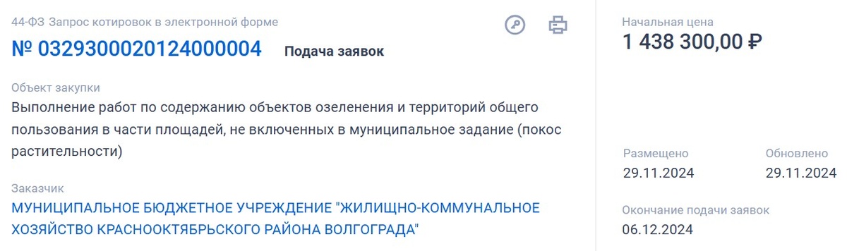 Начальная цена контракта в Краснооктябрьском районе составила 1,4 миллиона рублей и рассчитан он до конца 2024 года. Иными словами, исполнитель должен будет в декабре заниматься покосом сорняков по заявке заказчика в лице МБУ ЖКХ Краснооктябрьского района. Победитель закупки определится в начале декабря, а на выполнение контракта исполнителю отводят всего 15 дней. Иными словами, в то время как горожане будут наряжать в своих квартирах новогодние елки, на улицах города как раз придет время косить сорняки. В Кировском районе на срочный покос травы в декабре готовы потратить 442 750 рублей. В Дзержинском 731 299,52 рубля. В остальных районах самым поздним сроком для борьбы с сорняками стал сентябрь.