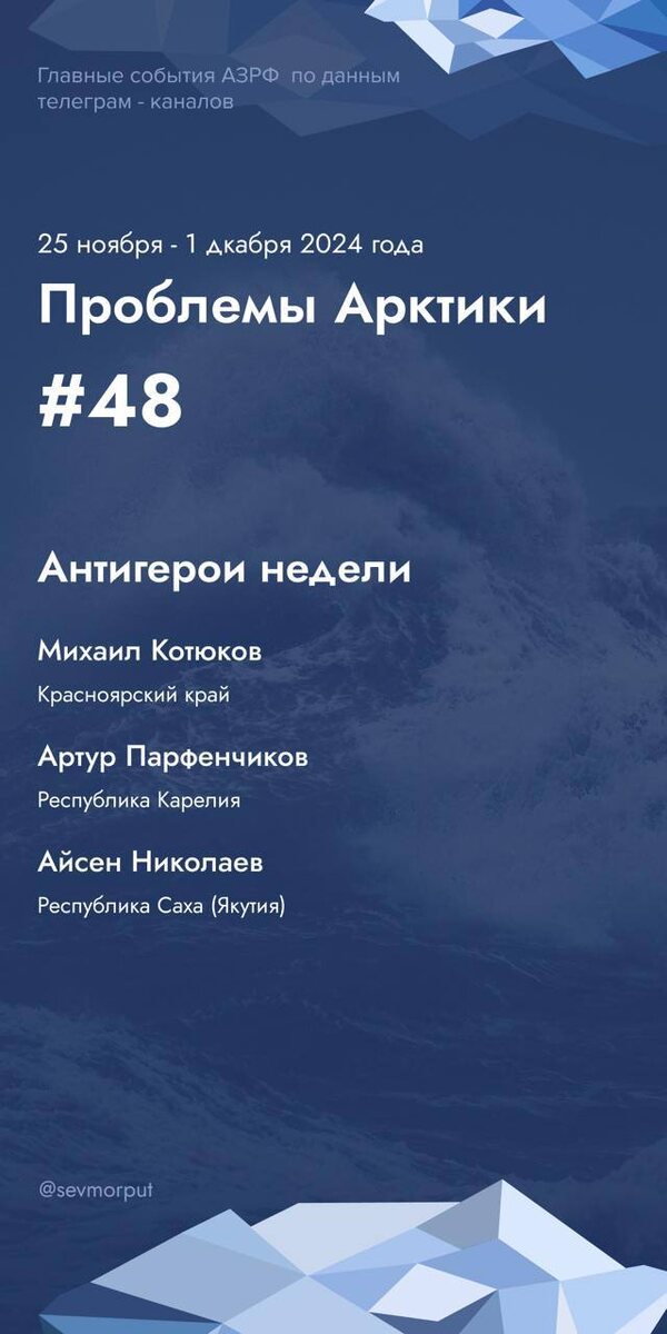 Представляем еженедельный рейтинг «Антигерои недели — Проблемы Арктики. Неделя 48». Михаил Котюков В Красноярске и Минусинске объявили режим неблагоприятных метеоусловий (НМУ), известный как «чёрное небо». В этих городах установилась безветренная погода, что осложняет рассеивание вредных веществ в воздухе. Власти призывают жителей ограничить время пребывания на улице и использование автомобилей. Также предприятиям предписано сократить выбросы в атмосферу. НМУ будет действовать до 2 декабря. Артур Парфенчиков Карелия сталкивается с острой проблемой нехватки учебных заведений. В регионе не строили новые школы почти 30 лет, а обновление инфраструктуры началось лишь в последние три года. Особенно остро стоит вопрос в Петрозаводске, где из-за перегрузки существующих школ нужно возводить новые образовательные объекты. Важно отметить, что в одном из поселков, Салми, школа расположена в зданиях, построенных в 70-х годах, где степень износа превышает 65%. Айсен Николаев В Якутии бывшие дол
