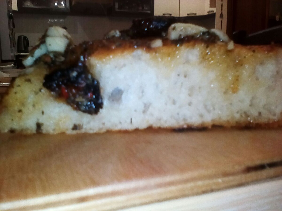 - Когда фокачча испечется, смажьте ее сверху чесночным маслом с помощью ложки. Переложите на разделочную доску, дайте немного остыть, нарежьте и подавайте.