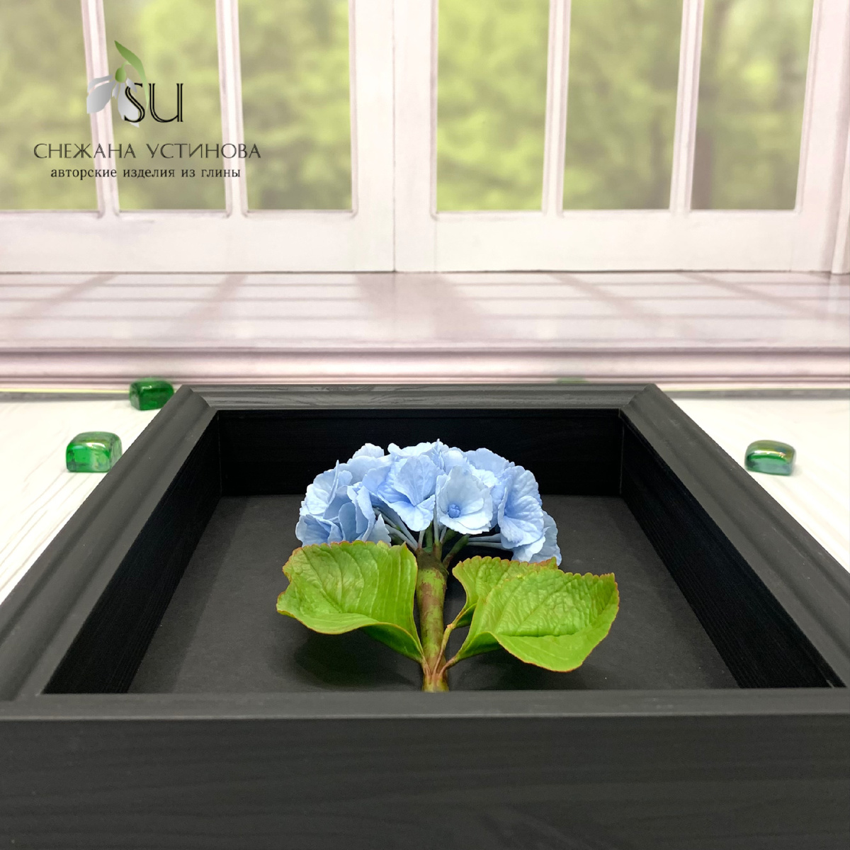 В ту ночь идея картины "Безмятежность" пришла ко мне как дыхание свежего воздуха. Возможно, это было магией лунного света, пронизывающего окно мастерской, а может, шёпотом душевного покоя, который я искала. Я хотела сделать что-то совершенно новое и необычное, что-то, что заставило бы людей затаить дыхание и ощутить тепло ручной работы. Так, я задумала создать трёхмерную картину — ветку голубой гортензии, которая своей нежностью прикоснулась бы к сердцу каждого. Скульптурная работа из холодного фарфора потребовала от меня деликатности и терпения. Я аккуратно лепила каждый лепесток, каждую мелкую деталь, чтобы цветок казался живым и дышащим. Хотя процесс был непродолжительным, он казался волшебным. Я управляла материалом так, будто пела ему колыбельную, и он послушно обретал форму в моих руках. Но настоящий вызов ждал впереди: как сделать так, чтобы ветка казалась парящей? Крепление гортензии к основанию — вот настоящее искусство. Я использовала прозрачные нити, изобретая способ создать