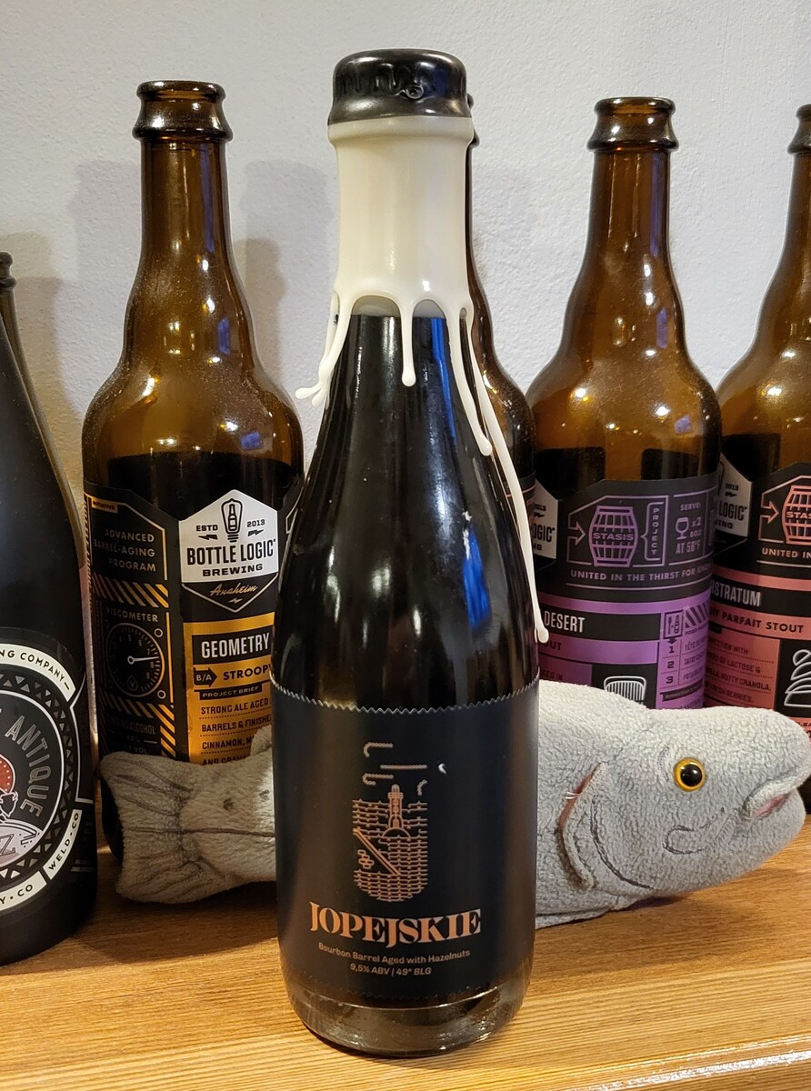 Нынче многие пивовары ищут какие-то региональные сорта пива, которые были забыты, чтобы дать им новую жизнь. Так, например, ожил когда-то забытый стиль гозе (и я вообще не о томатах!), возвращаются цвикели, кёльши и альтбиры... Вот и в Польше нашли Jopenbier (Jopejskie beer), который исторически был невероятной плотности и даже использовался как сироп от кашля. И бродил он забавным образом, сначала грибы плесени, потом дрожжи и потом созревание под пленкой флора (дрожжей, родственных штаммам, используемым для приготовления хереса, портвейна и мадеры) У нас тут версия от Browar Stu Mostów, которая два года провела в дубовой бочке а затем - еще год в бочках от Jim Beam и Wild Turkey, да еще и хареного фундука добавили!
