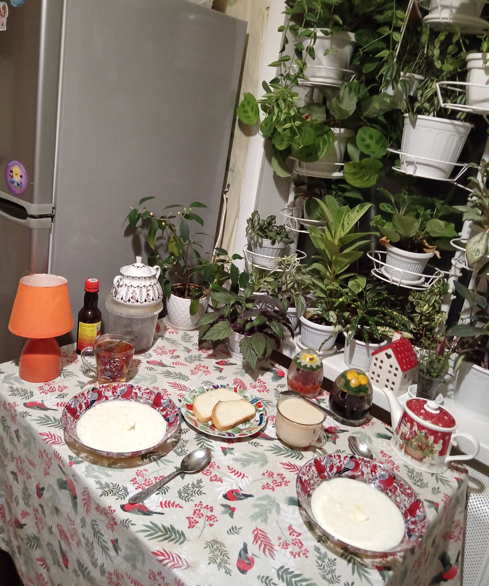 Полила цветы на подоконнике. Некоторым прохладно. Отодвинула подальше от стекла.