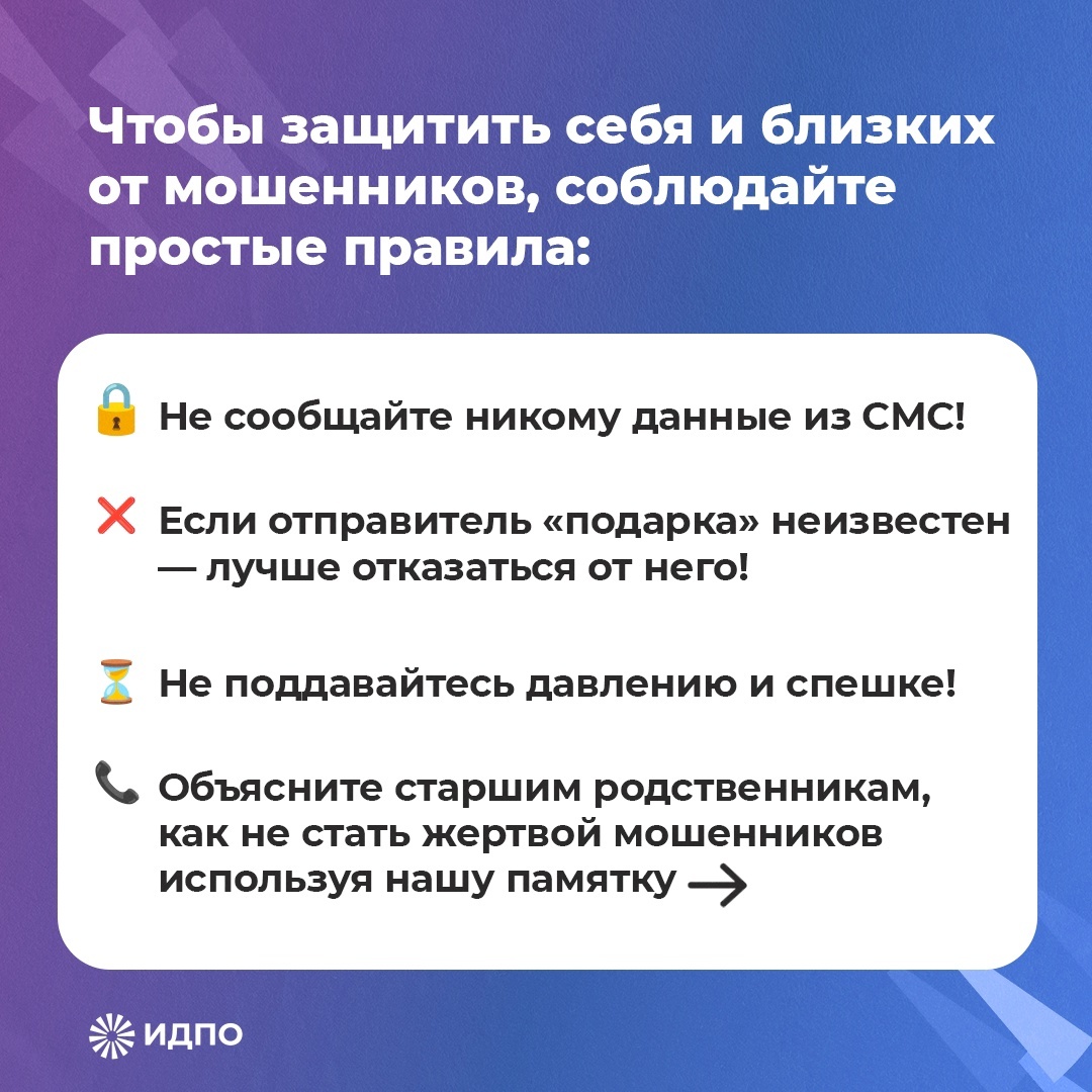 Креативность интернет-мошенников не знает границ. Новый способ обмана выглядит так: вы получаете небольшой подарок, а затем вас просят назвать смс-код, чтобы подтвердить успешную доставку. Итог всегда один – списанные деньги с вашей банковской карты. Расскажите старшим родственникам правила безопасности, чтобы они не пострадали от киберпреступников. «Мнимые подарки могут быть разными: букет цветов, коробка конфет, сертификат и так далее. Если отправитель неизвестен и не объявляется, — это повод насторожиться. Не стесняйтесь задавать уточняющие вопросы, перепроверять информацию, не делитесь личными данными в спешке», — рассказал руководитель отдела дистанционного и электронного обучения ИДПО Никита Куземкин. 🗂 В наших карточках вы найдёте полезные рекомендации о том, как вести себя подобных в ситуациях. Делитесь этим постом со своими близкими! Подписывайтесь на сообщество нашего Института ⬇