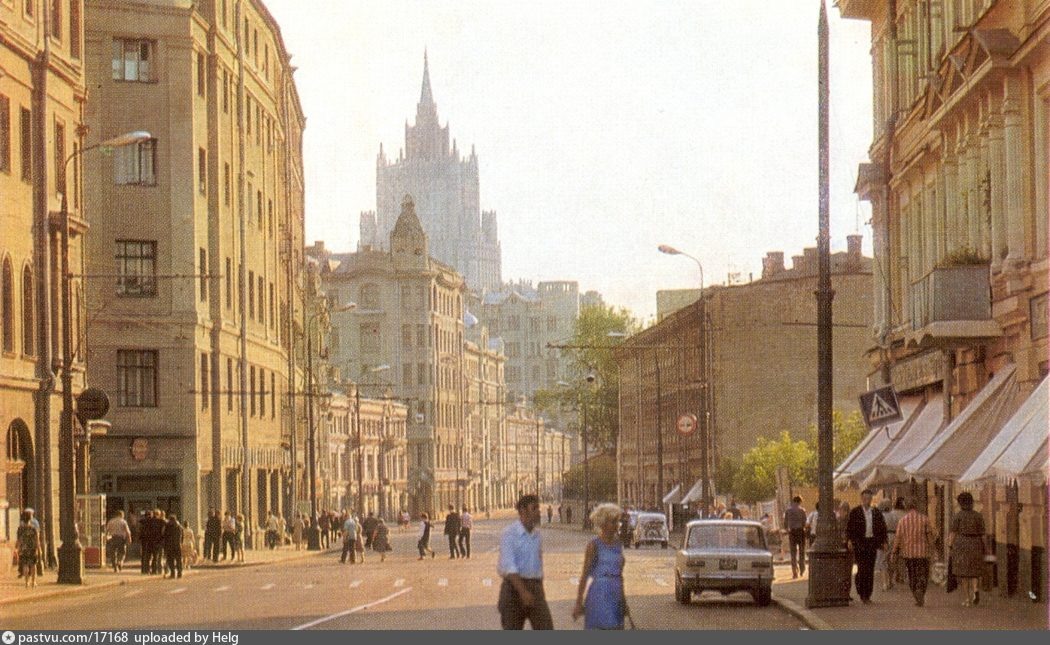 Давайте совершим очередную прогулку сквозь время, прогуляемся по волнам нашей памяти, вспомним, как мы жили тогда и посмотрим, что изменилось за прошедшие десятилетия. Поехали! ... Улица Арбат уходящая в сторону Садового кольца от площади Арбатские ворота. Тогда это была типичная улица в центральной части города, застроенная преимущественно домами постройки дореволюционных времён. Фото 1975 года В середине восьмидесятых годов улицу Арбат благоустроили и сделали полностью пешеходной, коей она и остаётся по сей день А это аллея ведущая от ВДНХ к проспекту Мира, где к Олимпиаде-80 возводится гостиница "Космос". Фото 1978 года Игорь Уткин Сейчас в кадре появилась монорельсовая дорога, а ещё вдоль неё проложили трамвайные пути, которые перенесли с проспекта во время строительства эстакады А это Комсомольская площадь, вид на Ярославский вокзал. Здесь утром и вечером всегда был большой поток людей приезжающих в город на работу, а вечером уезжающих домой. Здесь стоит обратить внимание на застр