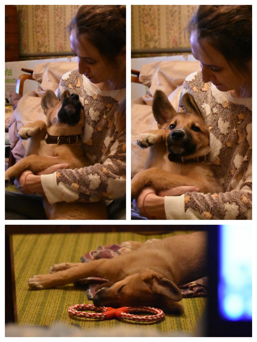 Ну, думаю, понятно уже, что никакого клеточного режима у моей собаки не было. Первый вечер сначала она была почти все время у меня на руках, потом я пристроила ее на полу, и сама рядом с ней примостилась. Так и спали.