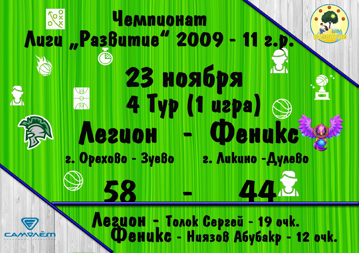 В категории 2009-2011 г. р. пока нет равных команде «Легион» из Орехово-Зуево. И в этот игровой день не смог устоять и «Феникс», уступив со счётом 58:44. Лучшим снайпером матча стал Сергей Толок, набравший 19 очков и вырвавшийся на третье место в списке снайперов всего чемпионата. Первое место делят Дмитрий Богословский («Сириус») и Александр Леушин («Легион»), набравшие по 54 балла. Но у баскетболиста «Сириуса» есть шанс оторваться от преследователей уже в следующем матче, когда 7 декабря клуб будет принимать гостей из г. Собинка.