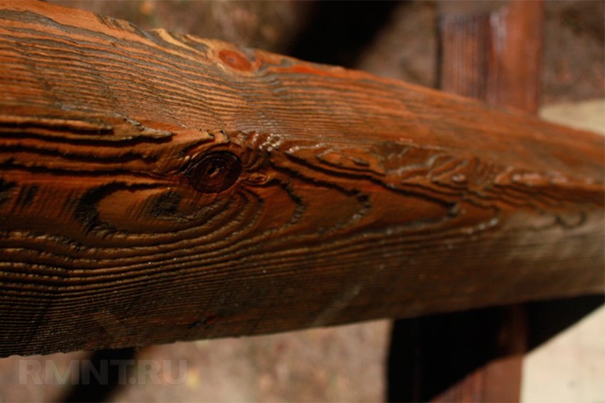 Более выраженный эффект можно получить, вскрыв дерево морилкой. Подобрав глубину тона в соответствии с используемой породой, вы придадите необходимую контрастность для выступающих рёбер и борозд. Для усиления эффекта морилку нужно вытирать сразу после нанесения: мягкие волокна в бороздах впитают её больше, чем твёрдые, и потому окрасятся в более тёмный цвет.