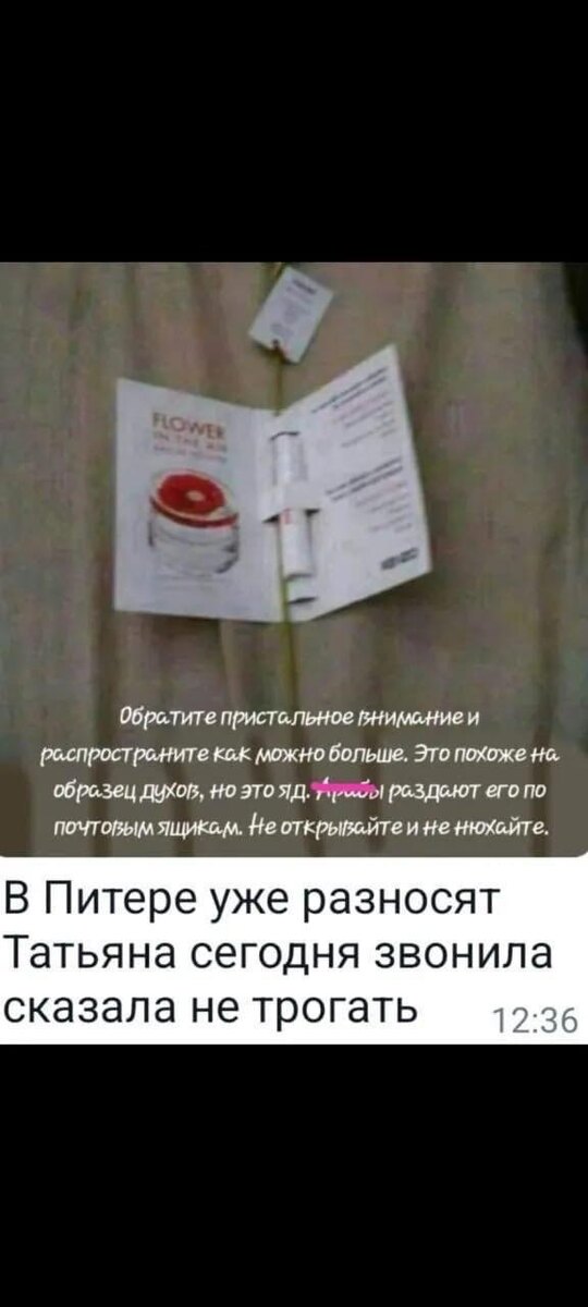 Активизировались гады. Бросают в почтовые ящики маленькие пробники духо́в известных фирм. Вроде, как акция и новогодняя распродажа. Открывать и нюхать их НЕЛЬЗЯ!!! ПАРА ВДОХОВ И МОЖНО СКЛЕИТЬ ЛАСТЫ!!! ПРЕДУПРЕДИ СВОИХ ЗНАКОМЫХ".