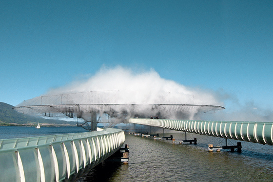 Туманное здание расположено в Швейцарии на берегу озера Невшатель в Ивердон-ле-Бен. Габариты 60 х 100 х 20 метров, выполнено из металла. В корпус вмонтированы специальные отверстия, распыляющие воду из озера вокруг здания. Цель постройки, показать людям, как они зависимы от природных явлений и собственного зрения. Посетители, попадающие в Blur Building по мосту, попадают в настоящую, непроглядную мглу. Атмосферная архитектура, представляющая собой туманную массу, образовавшуюся в результате воздействия природных и антропогенных факторов. Расположенный над водой, проект задуман как мультимедийный павильон для выставки "Экспо-2002" в Швейцарии с целью погрузить посетителей в захватывающую среду, которая ставит под сомнение их зависимость от зрения. Конструкция в форме диска поддерживается четырьмя колоннами и основана на принципе тенсегрити, который заключается в балансировке группы сжатых металлических профилей в сетке натянутых тросов. Вода закачивается из озера и распы