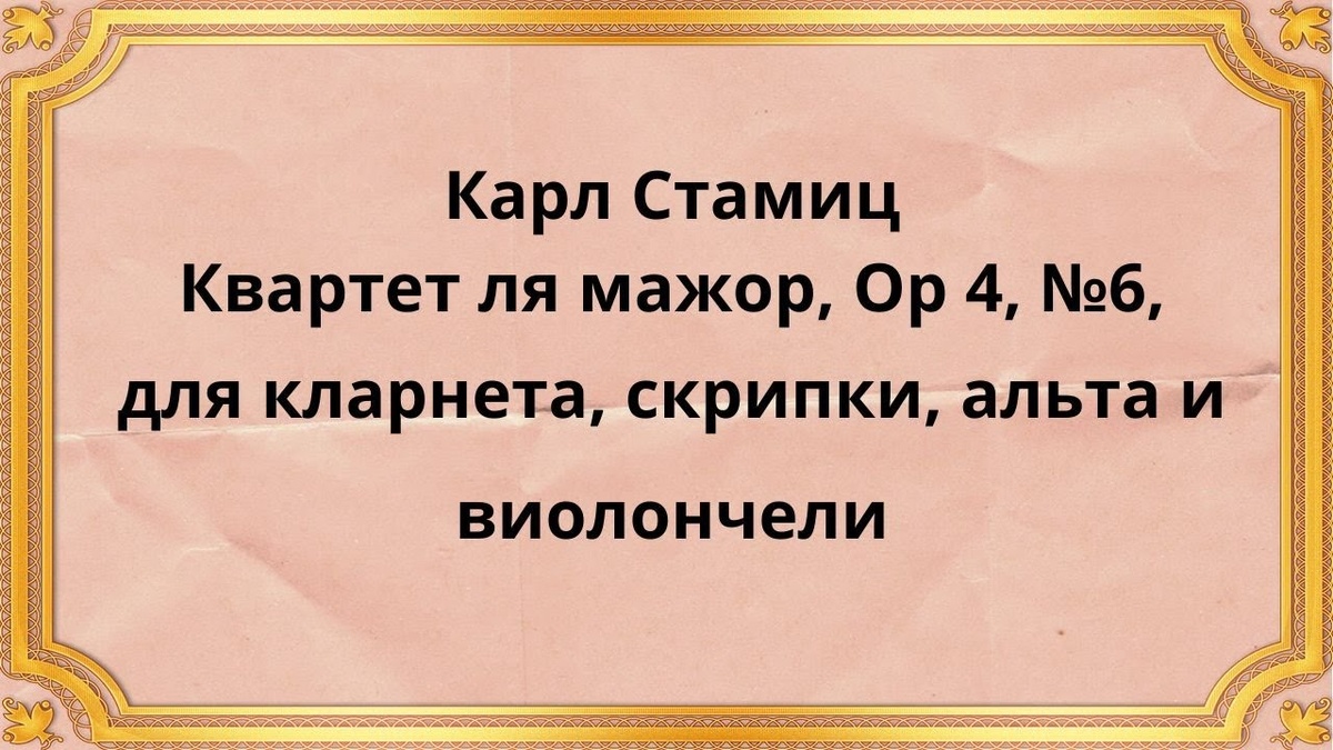 Карл Стамиц (1745–1801) был выдающимся композитором и скрипачом позднего классического периода, известным своим значительным вкладом в камерную музыку, особенно в игру на кларнете. Его квартет ля мажор, соч. 4, № 6, написанный в конце 18 века, является примечательным примером его камерных произведений, демонстрируя кларнет наряду с традиционными струнными инструментами — скрипкой, альтом и виолончелью. Этот квартет является примером элегантности и выразительности классического стиля, подчеркивая лирические и виртуозные возможности кларнета.