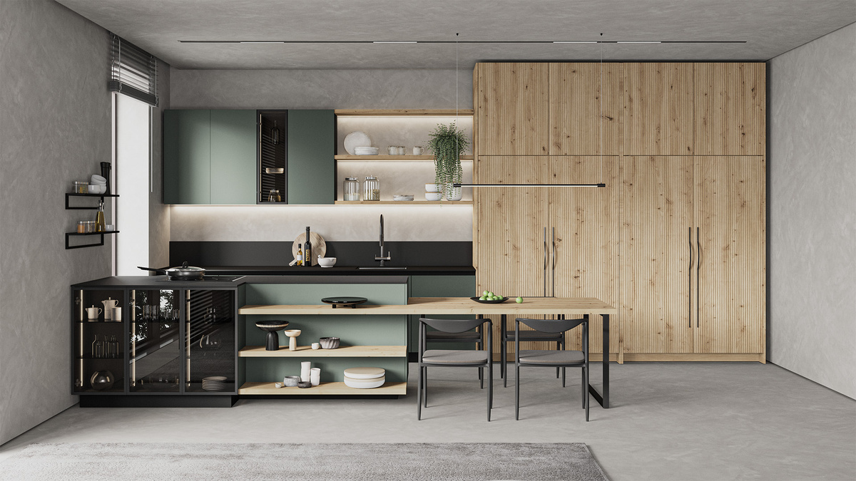 - Оптимизация хранения. Важно, что высокие шкафы могут быть оснащены различными современными системами хранения, такими как выдвижные корзины, встраиваемые полки, механизмы для лёгкого доступа к верхним ящикам. Все это помогает сделать кухню не только красивой, но и максимально удобной в использовании.