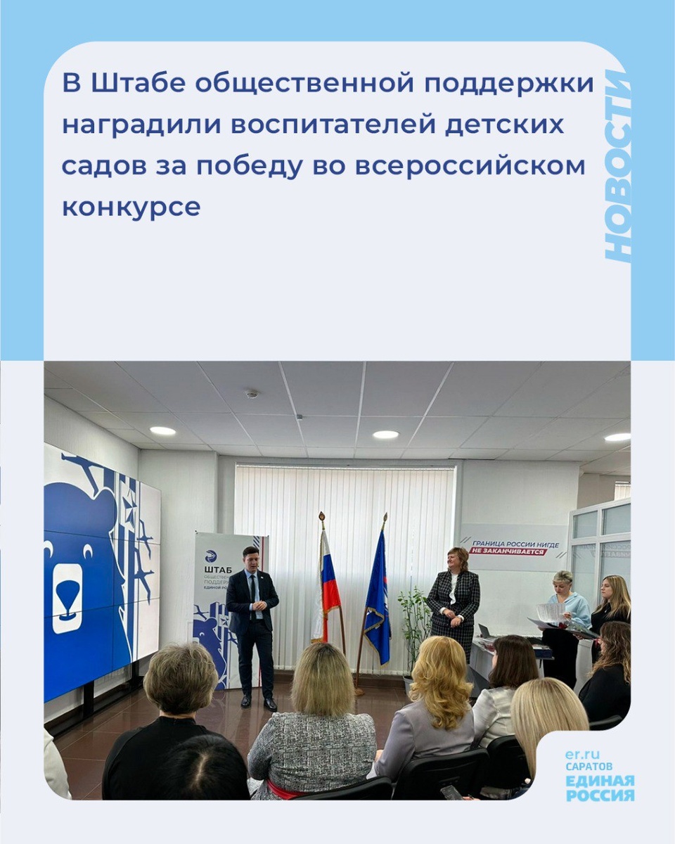 🏆Воспитатели из Саратова и районов области стали лауреатами XII Всероссийского конкурса «Воспитатели России». Конкурс проводился с 1 июля по 27 сентября. Организатором конкурса выступает Всероссийская общественная организация содействия развитию профессиональной сферы дошкольного образования «Воспитатели России» при поддержке партии «Единая Россия». 👏🏼Участие в награждении принял заместитель председателя Саратовской городской Думы Александр Бондаренко. Он поздравил победителей из города Саратова и вручил им заслуженные награды, пожелав дальнейших успехов в профессиональной деятельности и новых творческих свершений. 💬«Конкурс проводился в целях выявления, поддержки и распространения инновационного опыта педагогических работников, воспитателей и руководителей государственных и частных образовательных организаций, развивающих детских центров. Отрадно, что из Саратова и районов нашей области так много победителей и призеров этого конкурса. Это говорит о высоком профессиональном ур