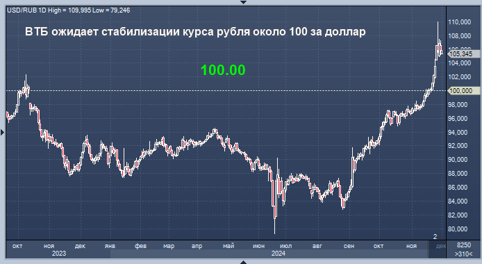 ВТБ ожидает стабилизации курса рубля около 100 за доллар Курс доллара к рублю расчётный, фьючерс, вечный фьючерс и межбанк. Курс евро к рублю расчётный, фьючерс, вечный фьючерс и межбанк. Курс юаня к рублю биржевой, фьючерс, вечный фьючерс и межбанк. После периода нестабильности, вызванного санкциями США против финансового сектора России, курс российского рубля стабилизировался на уровне около 100 за доллар США. Об этом в понедельник в интервью Reuters сообщил Андрей Костин, генеральный директор второго по величине банка России — ВТБ. После введения США санкций против «Газпромбанка», который отвечает за торговлю энергоресурсами между Россией и Европой и является основным источником валюты для российского рынка, курс рубля снизился на 15% по отношению к доллару. «В 2022 году, если вы помните, доллар достигал 120 рублей. Сейчас происходит коррекция, курс немного выше 100, и я думаю, что он останется на этом уровне», — отметил Костин. Кроме того, Костин сообщил, что после введения западны