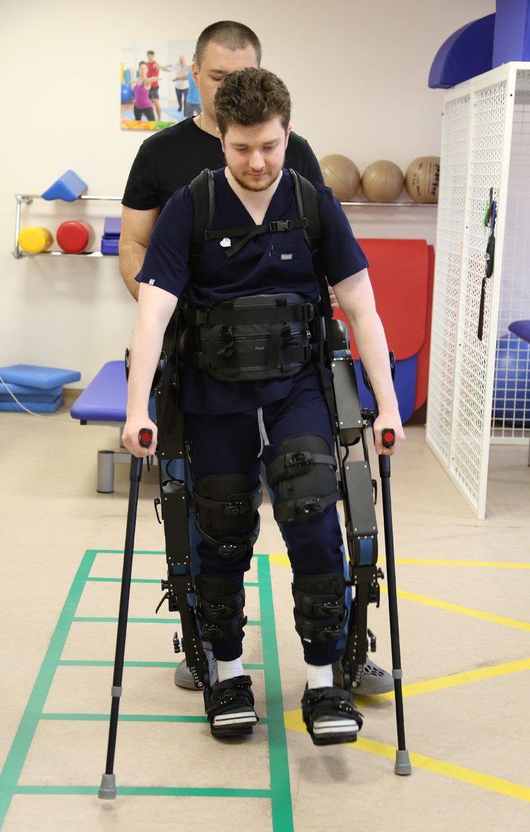 Экзоскелет создает опору для тела, благодаря которой пациенты получают возможность вставать, садиться, ходить, подниматься и спускаться по лестницам без посторонней помощи.