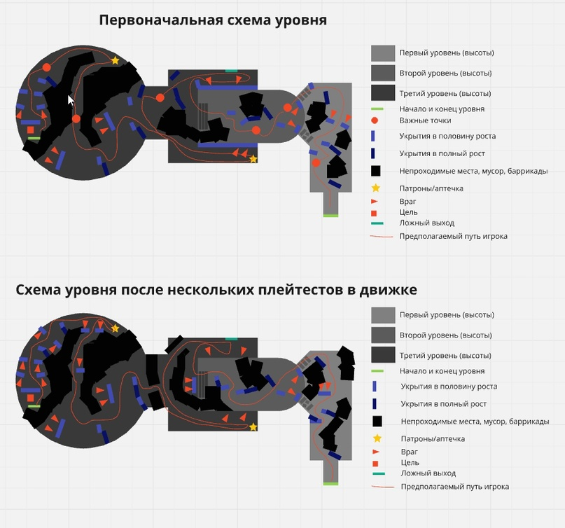 Поиграть: ссылочка Я решил немного попрактиковаться и создал несложный уровень. Контроллер я взял готовый из Asset Store Unity, вот ссылка на него. Я не могу гарантировать, что он будет работать без проблем, но я сам играл с ним и проводил несколько плейтестов с добровольцами. Пока всё работает нормально, за исключением того, что он не очень хорошо забирается на рампы. Уровень ещё не доработан, он на стадии грейбокса. Небольшой экскурс в историю: шутер от первого лица, в котором игрок должен уничтожить всю верхушку могущественной банды, связанной с наркокартелем. По сути, это просто тир. Локация представляет из себя часть крыла поместья главы наркобизнеса. Однако, разрабатывая уровень, я не был ограничен архитектурными канонами. Поэтому я больше ориентировался на геймплей, почти полностью упустив из виду архитектурный замысел. Цель уровня — уничтожить всех головорезов. Уровень проходится довольно легко, без особого напряжения. Это просто тир, где враги уже заняли свои позиции и забарри