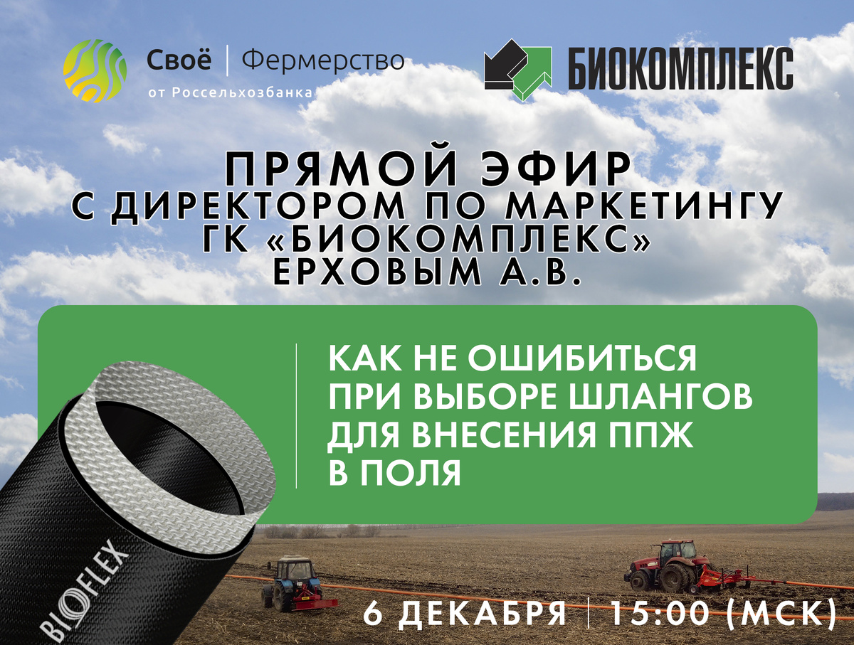 Директор по маркетингу ГК БИОКОМПЛЕКС Антон Ерхов 6 декабря в 15:00 в прямом эфире на портале «Своё Фермерство» расскажет про то, как не ошибиться при выборе шлангов для внесения ППЖ в поля. О чем поговорим: ✅ Почему шланги? В чем выгоды внесения ППЖ шланговыми системами? ✅ Чем отличаются технологии производства шлангов, и как они влияют на надежность и долговечность? ✅ Почему шланги рвутся, изнашиваются и стираются? Причины и следствия. ✅ Что скрывается за терминами адгезия, кинкинг и двойные проходы? ✅ Китай, Европа или Россия? — обзор рынка. Подключайтесь к встрече, чтобы поговорить со спикером в прямом эфире (для подключения со смартфона установите приложение ВКонтакте или ВК–звонки): ✅ Присоединиться к онлайн–встрече ✅ Задать вопрос ✅ Напомнить об онлайн–встрече