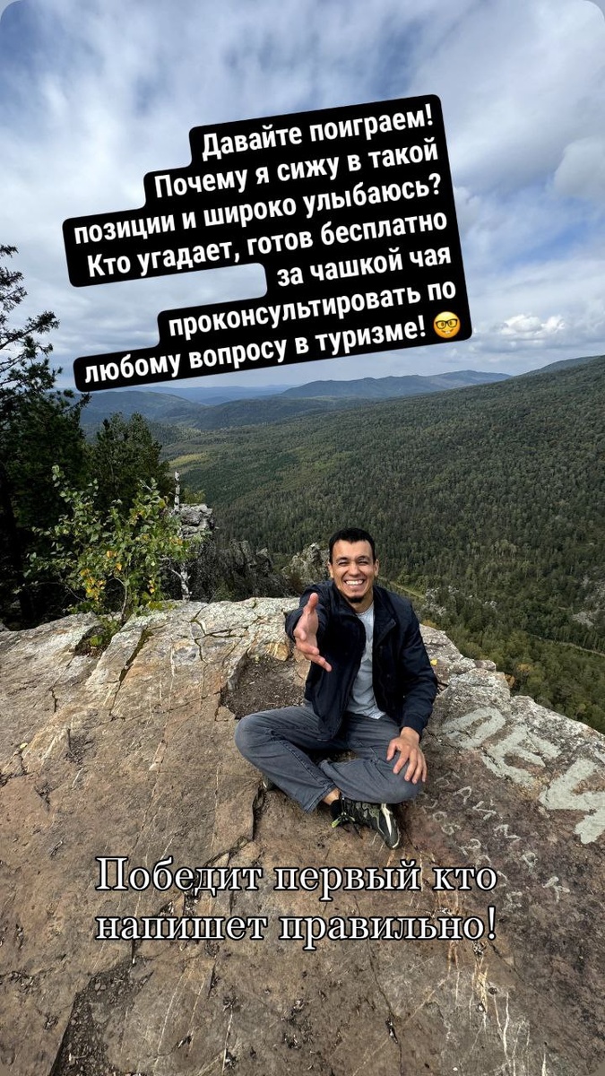 Давайте поиграем! Почему я сижу в такой позиции и широко улыбаюсь??? Кто угадает и ответит правильно, готов бесплатно за чашкой чая проконсультировать по любому вопросу что знаю в туризме по Башкирии и Южном Уралу и блогерстве. 1 подсказка) фотографию делает девушка если угадали, пишите в комментариях правильный ответ! 2 подсказка) все фотографы меня поймут/ если угадали, пишите в комментариях ниже правильный ответ! 3 подсказка) Вот представь! ты очень красивая девушка, ты перефоткалась где только можно и невозможно. Москвичка в общем.