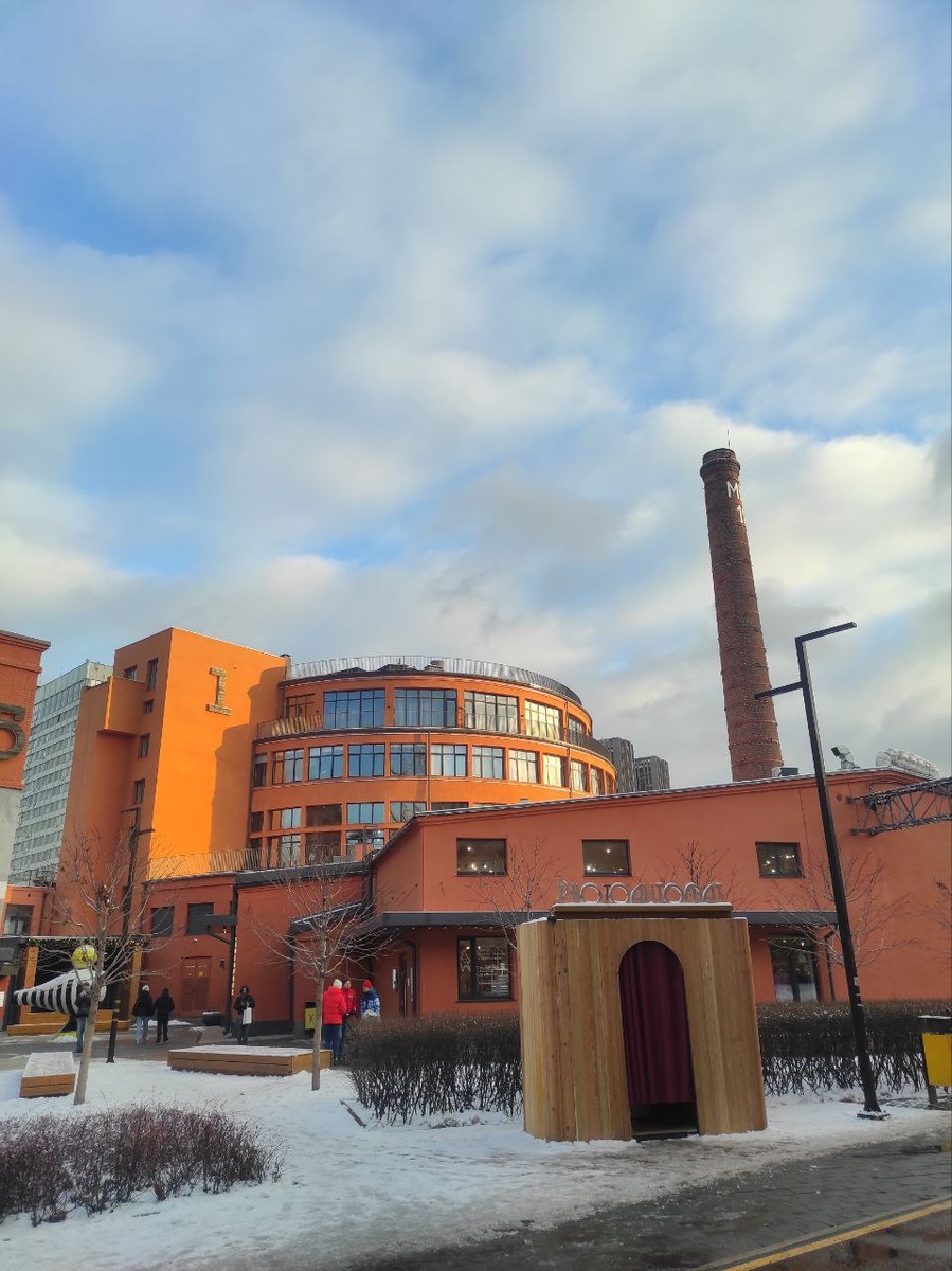 Начинаем маршрут со стороны Новодмитровской улицы. Встречает нас самая настоящая живая ёлка, которая гостеприимно сообщает нам, что ожидание нового года наступило и на Хлебозаводе. Минималистичная вывеска кофейни «Floo» сразу подмигивает нам с порога. Улыбнувшись ей в ответ, идём дальше, хотя издалека примечаем – людей там много. По дороге встречается большущий ангар – «Внутри Шоу» - с говорящим названием. А потом и еще одно "говорящее" месте