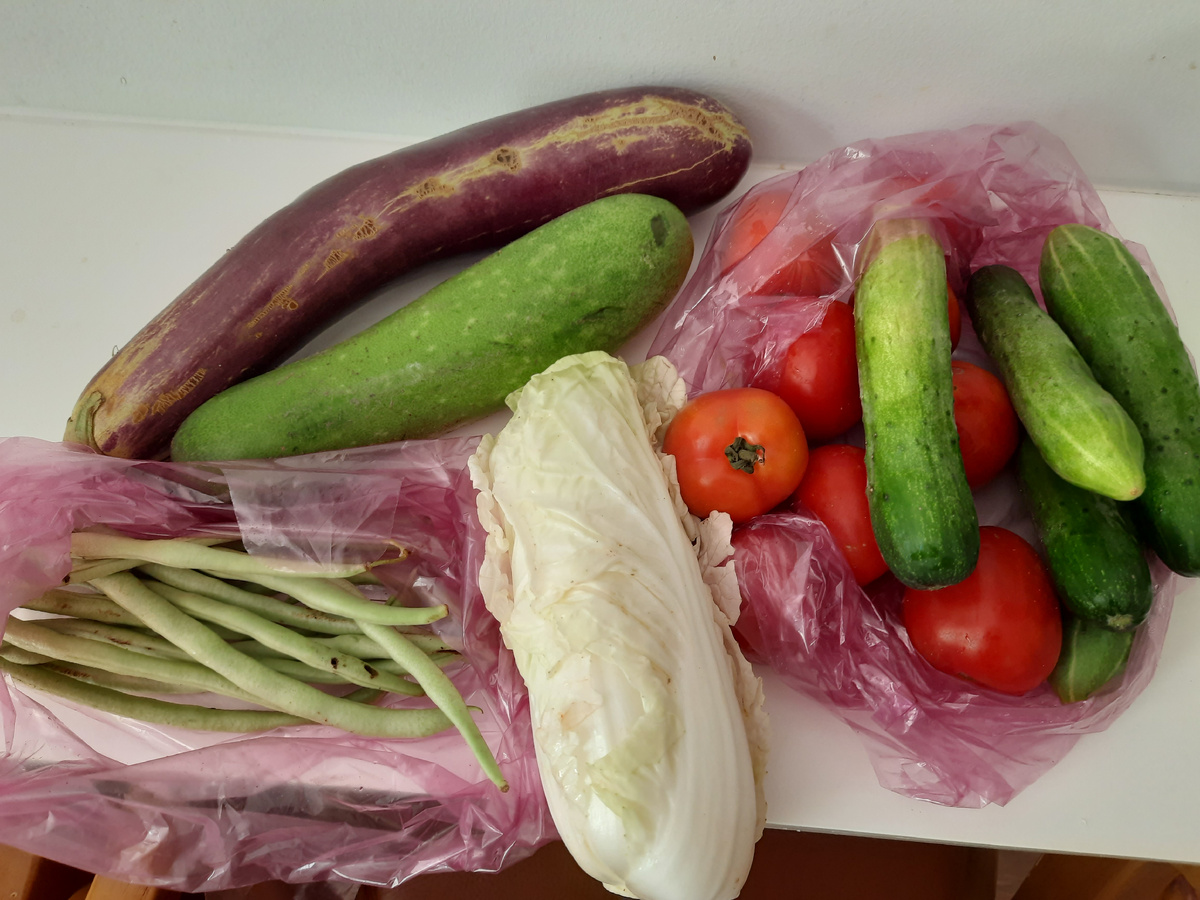Итак, после завтрака мы поехали на ближайший рынок. Купили там овощи: баклажан, кабачок, пекинскую капусту, спаржевую фасоль, помидоры, огурцы. В этот раз взяла все у другой тетушки. А она не стала заморачиваться и взвешивать каждый вид овощей по отдельности, а свалила всё в один пакет и по одной цене посчитала:). Всё по 25 тыс. донгов (110 руб.), так как взяла с меня 50 тыс. донгов, а вес был 2 кг.