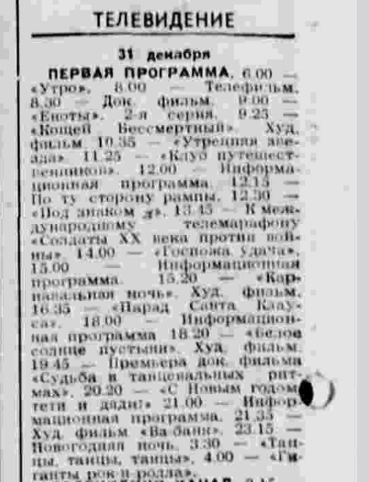 В данной публикации давайте посмотрим, какие фильмы демонстрировались на нашем ТВ 31 декабря 1991 года. То было время тревожности, время раздумий, время осознания событий. 26 декабря 1991 года Советский Союз официально прекратил своё существование. Далее я разместил фрагменты программы телепередач на 31 декабря 1991 года Я взял их из газеты "Правда". Качество скриншотов довольно посредственное, а потому можно нажать картинку вправо, там откроется еще один найденный вариант программы с более четким текстом. А далее текстом. Я выделю только фильмы, которые были вставлены в сетку вещания. Телепередачи были разные - как для детей, так и для взрослых. Документальный фильм - "Песня Леля", 1991 года Истории из жизни Николая Зубарева - деревенского человека живущего в городе. «Вятский Лель» долгое время внимательно слушал, как говорят вятские бабушки, дедушки и люди разных социальных положений и возрастов, а потом научился мастерски копировать их диалоги и монологи. "Кащей Бессмертный", 1