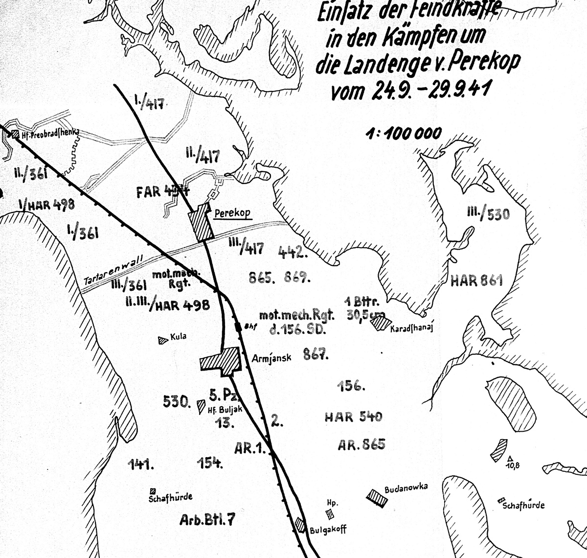 Загадок в обороне очень много Перекопа. Мы лишь совсем немного кослулись этой темы в предыдущей статье. В реальности, вопросов гораздо больше. Ну, казалось бы, все просто и понятно: правый фланг обороны занимал 417-й полк 156-й стрелковой дивизии под командованием подполковника Юхимчука.