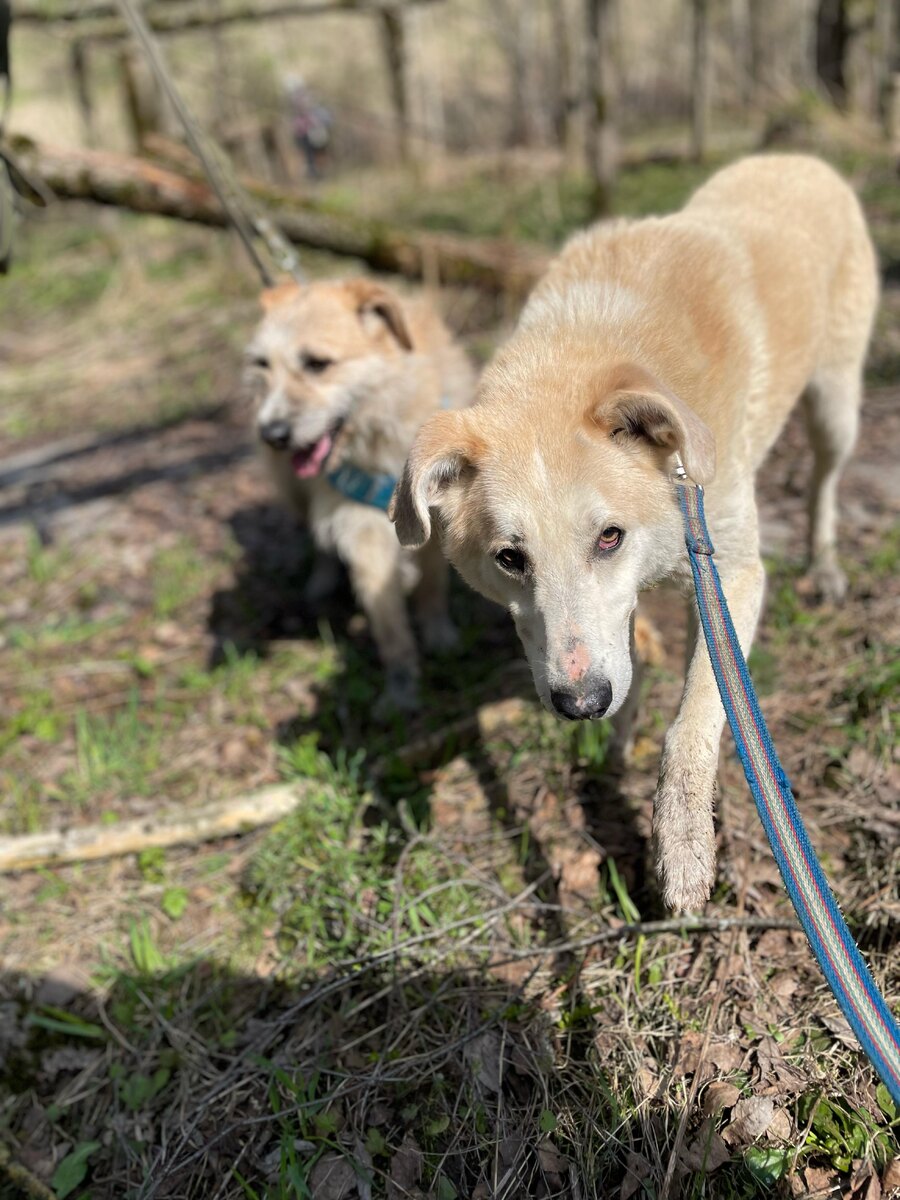 Эти собаки, наверное, не родственники, но точно закадычные друзья. Так и не разлучались друг с другом, до сих пор сидят в одном вольере и прекрасно ладят друг с другом.