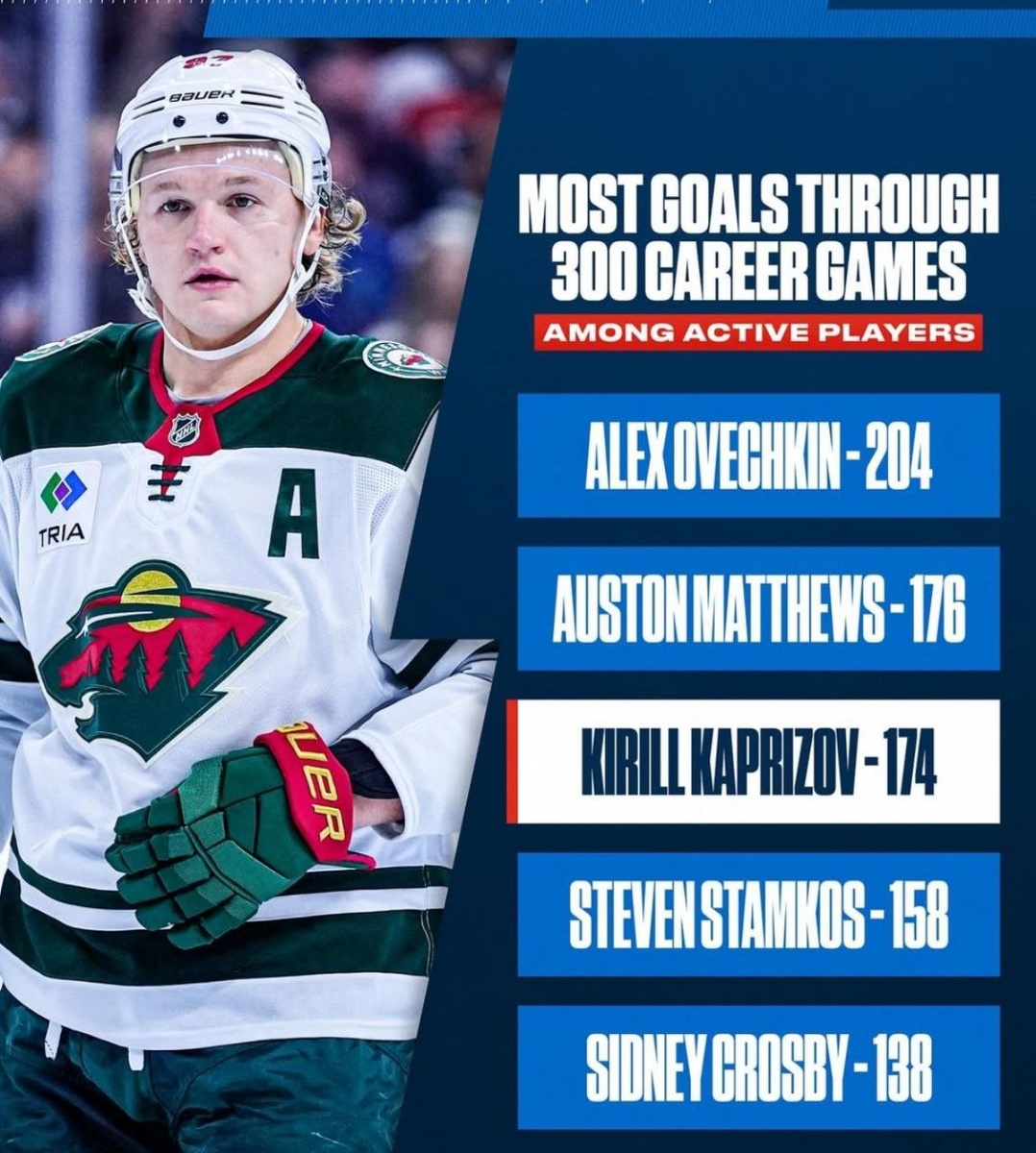 Как отмечает популярное издание Sportsnet, за первые 300 игр в НХЛ российский нападающий «Уайлд» забросил 174 шайбы: среди действующих игроков только двое – Александр Овечкин и Остон Мэттьюс – забивали на этом отрезке больше.