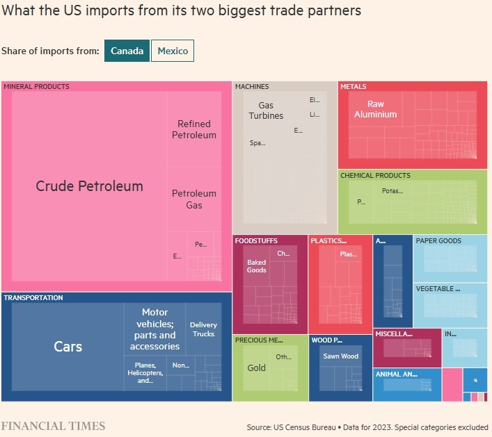 Что США импортируют у двух своих крупнейших торговых партнеров. FT. Источник: Бюро переписи населения США. Данные за 2023 год. Исключены специальные категории.